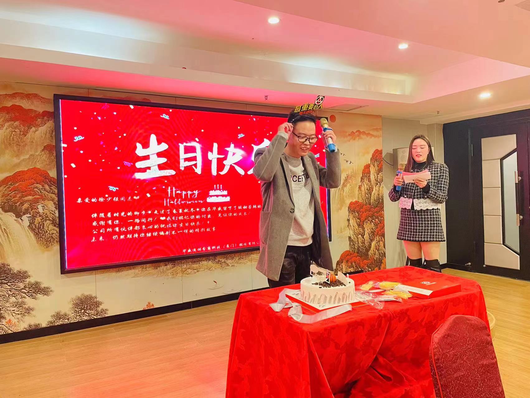 今晚的盛会还迎来了徐少强同事的生日,在颁奖结束之际,大家一起为徐少强同事庆生。生活需要仪式感,工作需要归属感,从懵懂无知到长大成年,每一年生日都是我们生命中新的里程碑,每一年的生日都值得被铭记,为加强对员工的人为关怀,增强员工的归属感,让大家感受到公司对大家的关心与关爱,在此请允许我代表公司对这位恰逢年会的特别时刻跟寿星说一声生日快乐,祝福寿星年年有今日岁岁有今朝,工作棒棒,钱包鼓鼓的!